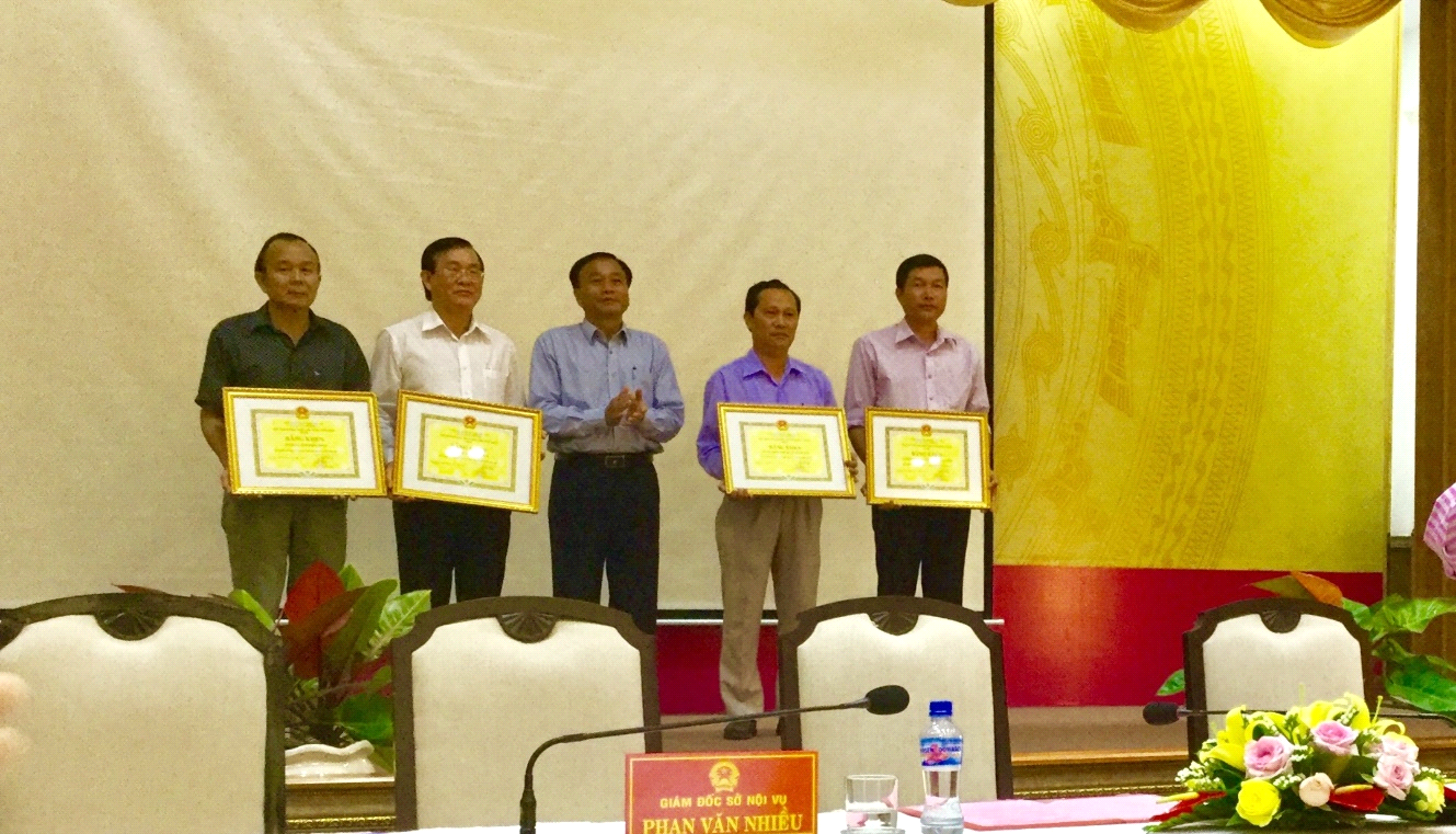 Đ/c Nguyễn Trung Dũng - Giám đốc Sở Tư pháp (bên trái) nhận Bằng khen của UBND tỉnh trong Hội nghị trực tuyến công bố chỉ số Cải cách hành hính năm 2017 |